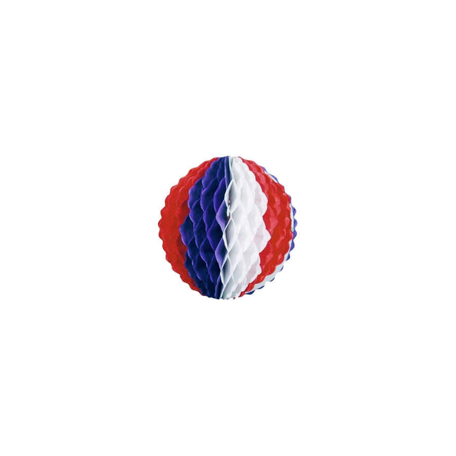 Boule en papier alvéolé ignifugée de couleur bleu, blanc et rouge. Cet accessoire tricolore fait 25 centimètres de diamètre et est idéale pour une fête basée sur la Révolution française ou pour toute autre fête nationale.