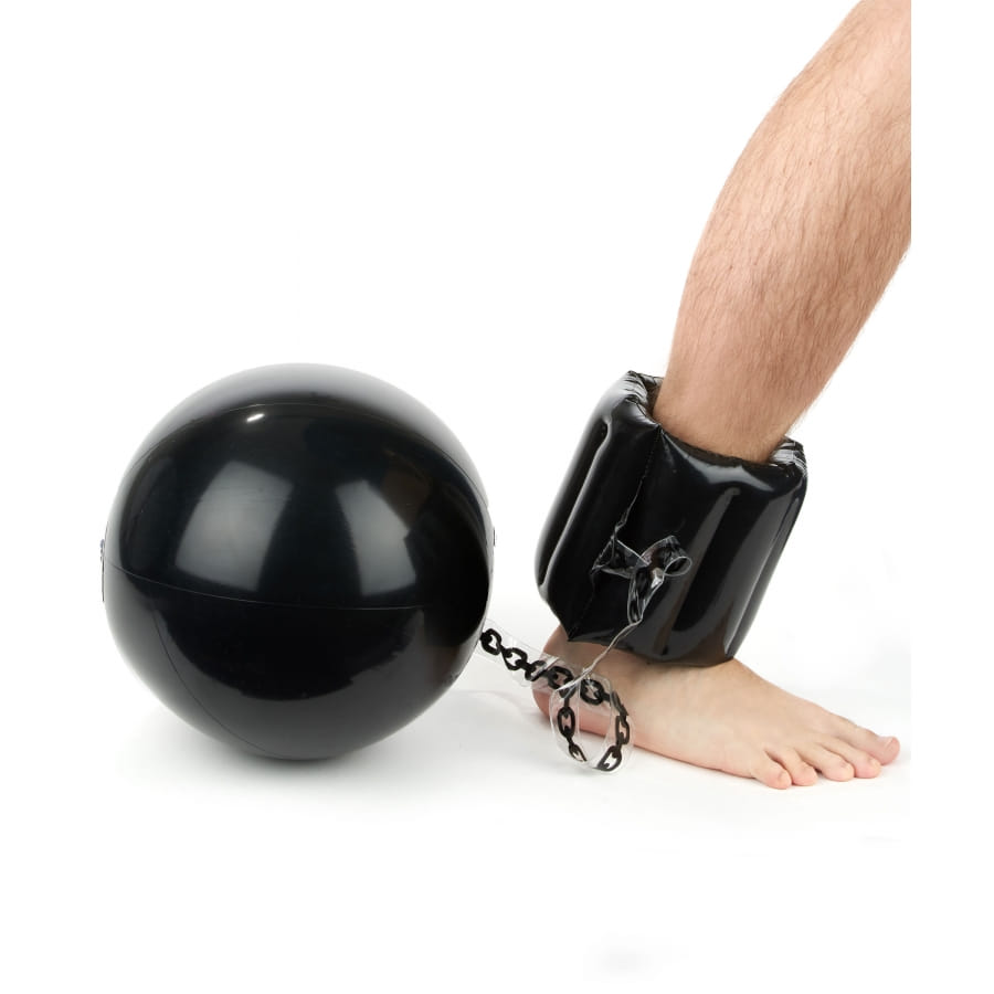 L'accessoire est formé par une boule noire gonflable de 30 cm de diamètre, accompagnée d'une attache gonflable pour la cheville ainsi que d'une bande en plastique transparente sur laquelle a été peinte une chaîne de couleur noire.