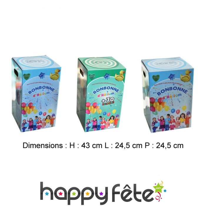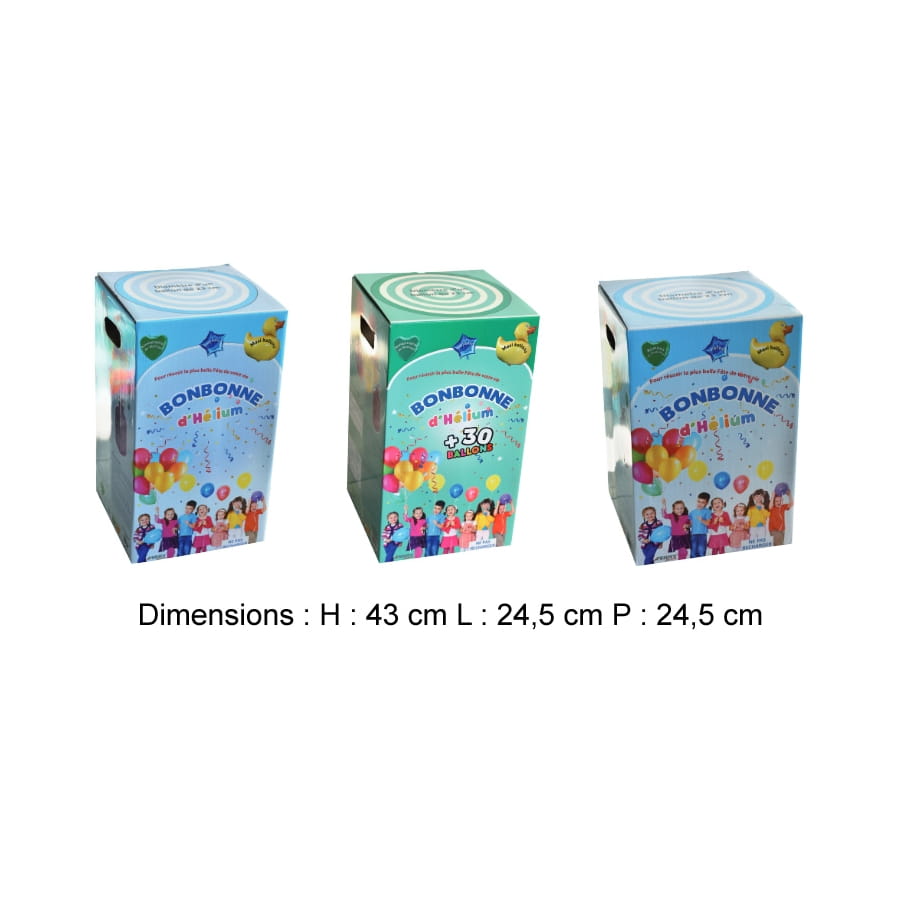 • Bouteille d'hélium H : 43 cm L : 24,5 cm P : 24,5 cm. 0.25 m cubes (convient pour 20/30 ballons de 23cm de diamètre) 0.42 m cubes (convient pour 50 ballons de 23cm de diamètre)