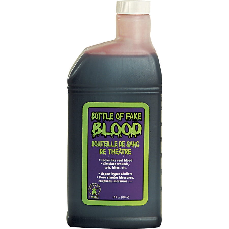 La bouteille est en plastique et est remplie de 480 ml de faux sang pour se maquiller ou imbiber quelques parties du costume.