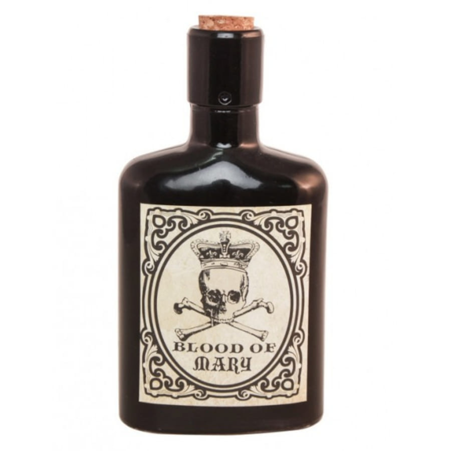 Le centre de cette étiquette présente un dessin de squelette (dans l'idée d'un squelette de drapeau pirate) couronné ainsi que l'inscription Blood of mary (sang de mary).