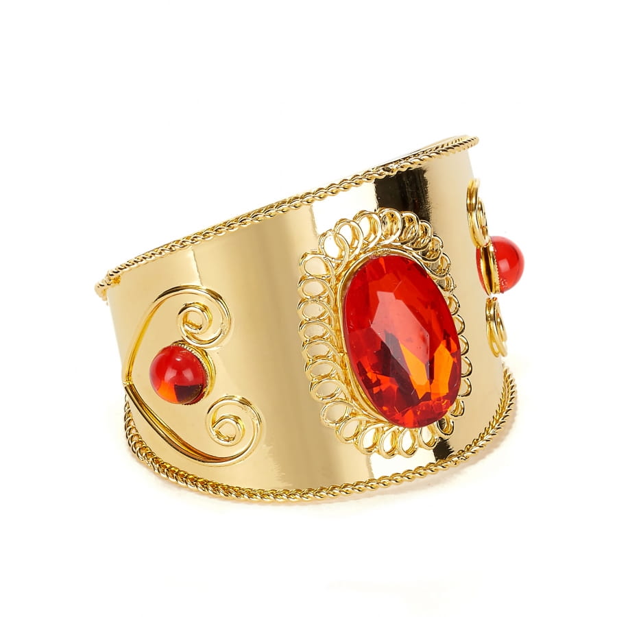 La manchette est de couleur or et est décorée avec des motifs gravés ainsi que de fausses gemmes rouges.