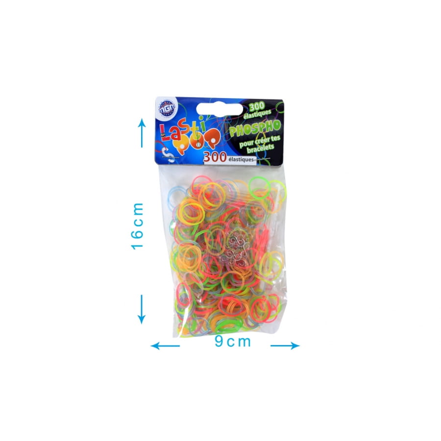 Connaissez-vous les bracelets loom ? Il s'agit de la tendance du moment question bijoux, et vous avez l'opportunité d'en fabriquer vous même. Voici un sachet de 16 x 9 cm de dimension. Il contient 300 petits anneaux élastiques multicolores et phosphorescents. Pour obtenir des bracelets uniques, amusez-vous à assembler les couleurs ! Vous obtiendrez alors des modèles ultra originaux qui brillent dans le noir !