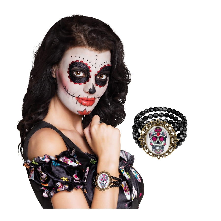 Apportez une jolie touche mexicaine à votre costume d'Halloween avec Bracelet jour des morts ! Cet accessoire incontournable se présente comme un joli bracelet fait de perles noires à trois rangées. Le centre du bijou est décoré d'un superbe médaillon en forme de cadre rond avec une image de tête-de-mort coloré en son centre. Classe et macabre !