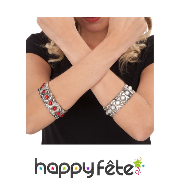 Ce bracelet de couleur argentée est tout orné de gemmes rondes de couleur rouge.