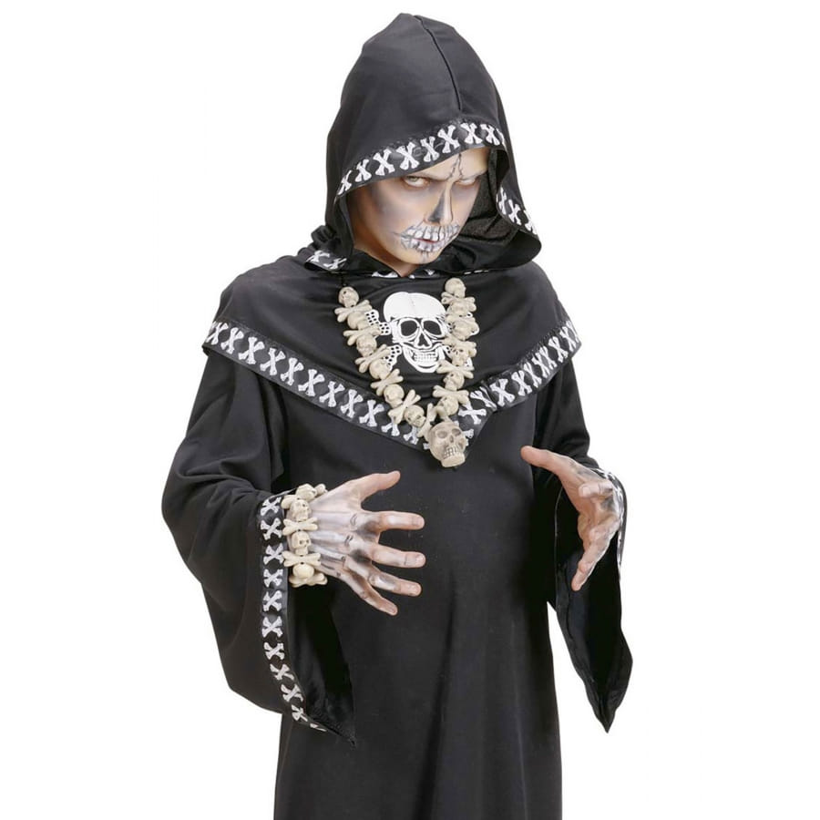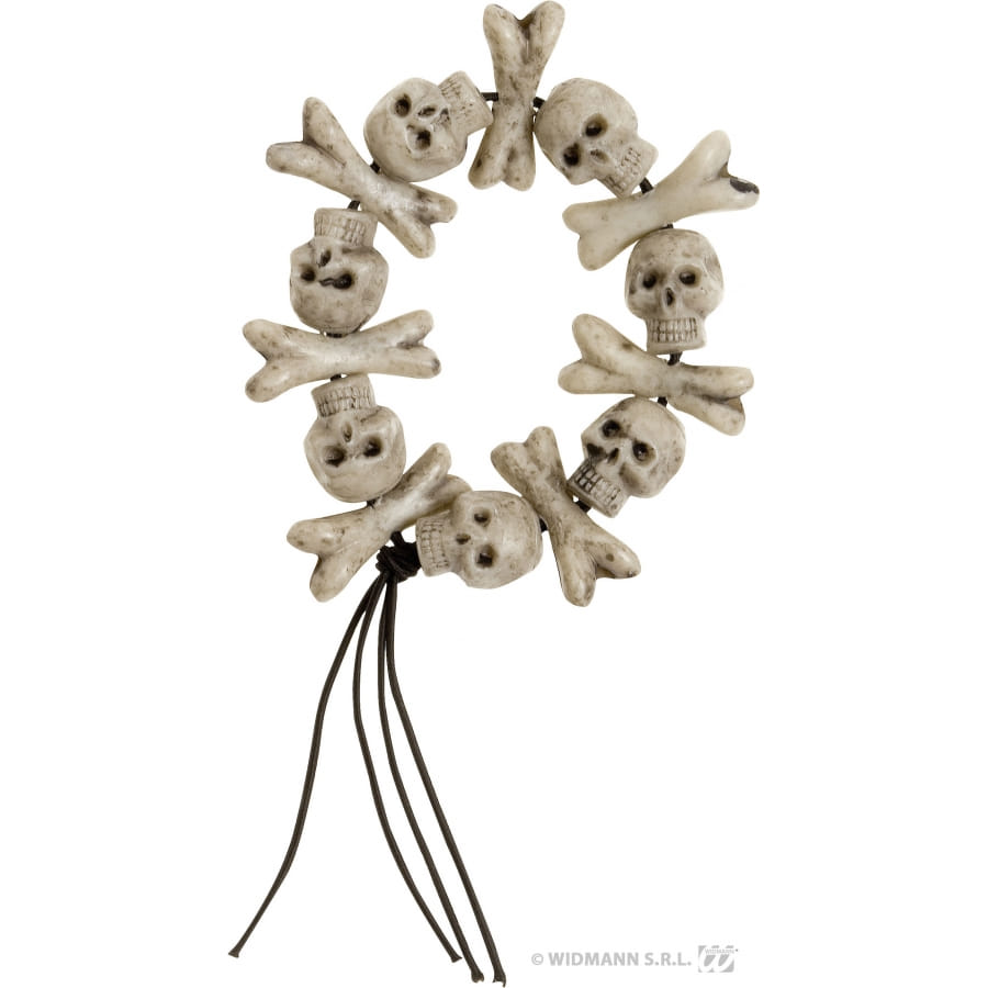 Bracelet noir composé de petites têtes de mort et d'os de couleur blanche, pour homme, femme, adolescent ou adolescente. Cet accessoire convient parfaitement à un thème de soirée gothique ou à une soirée d'Halloween.