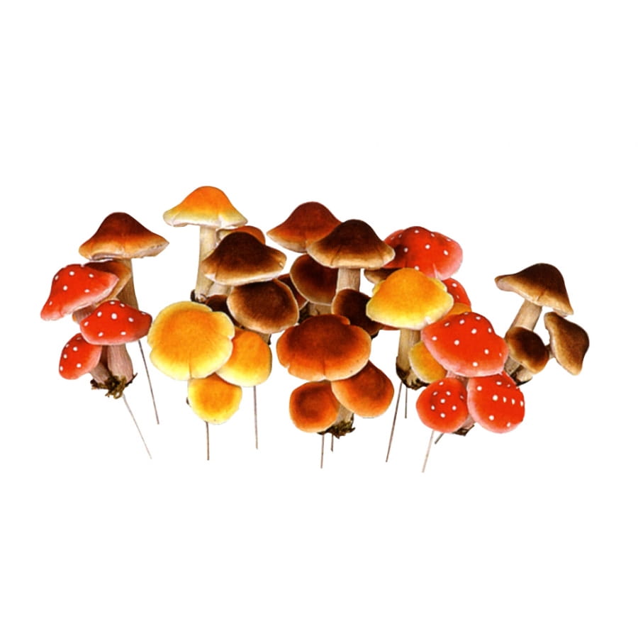 Branche de 3 champignons de couleur beige, marron et rouge. Chacun des champignons mesure 8 centimètres. Il est impossible de choisir le modèle ou la couleur au moment de passer la commande. Vous recevrez un des 4 modèles de champignons disponibles. C'est une décoration idéale pour un thème basé sur la nature.