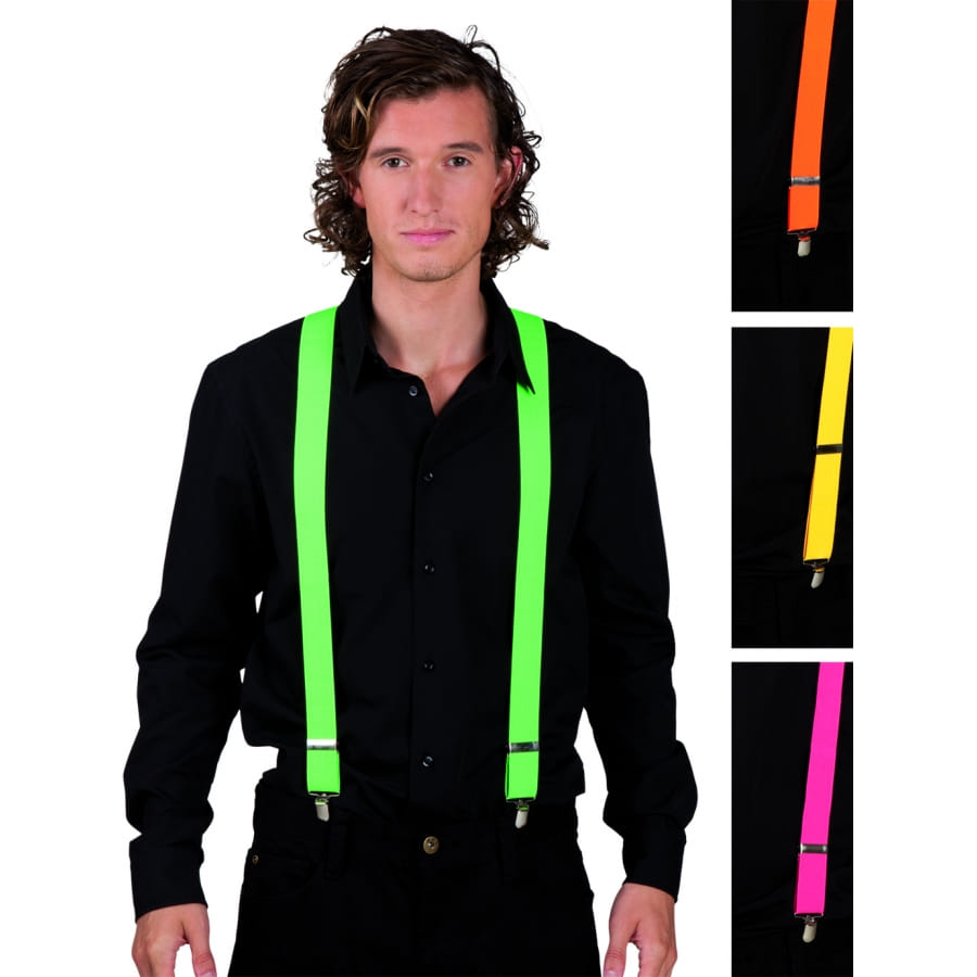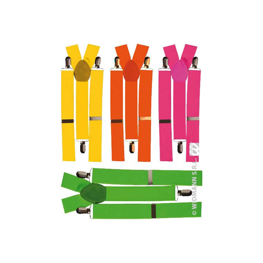 Paire de bretelles de clown de couleur fluo, pour homme ou femme. Au moment de passer la commande, vous ne pourrez choisir ni le modèle ni la couleur. Vous recevrez le modèle en jaune, rose, rouge ou vert. Servez-vous de ces bretelles pour une tenue de cirque parfaitement réussie.