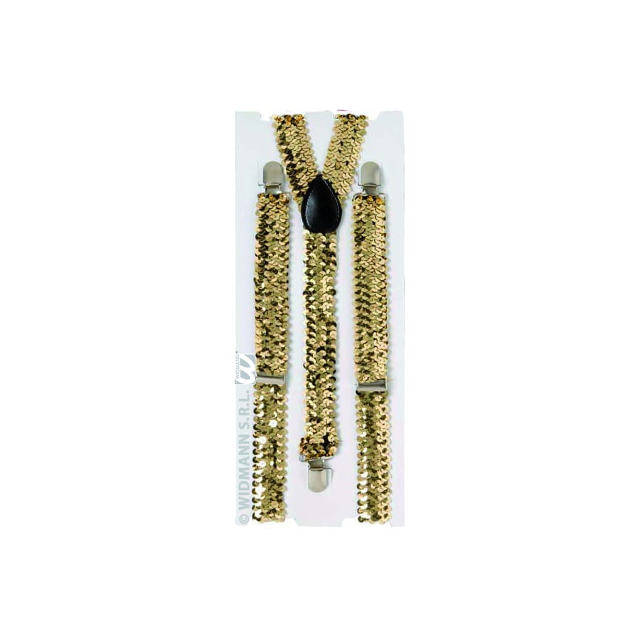 Bretelles dorées avec clips argentés. Ces brettelles de pantalon élastiques recouvertes de paillettes vont seoir à merveille à une tenue de danseur lors d'un carnaval ou pour une soirée disco. Messieurs, vous allez briller de mille feux avec ces bretelles!