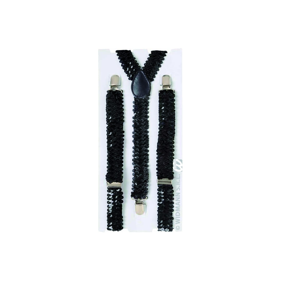 Bretelles noires avec clip couleur argent. Ces bretelles pour homme sont recouvertes de paillettes. Elles sont élastique et sont idéales pour une soirée cabaret.