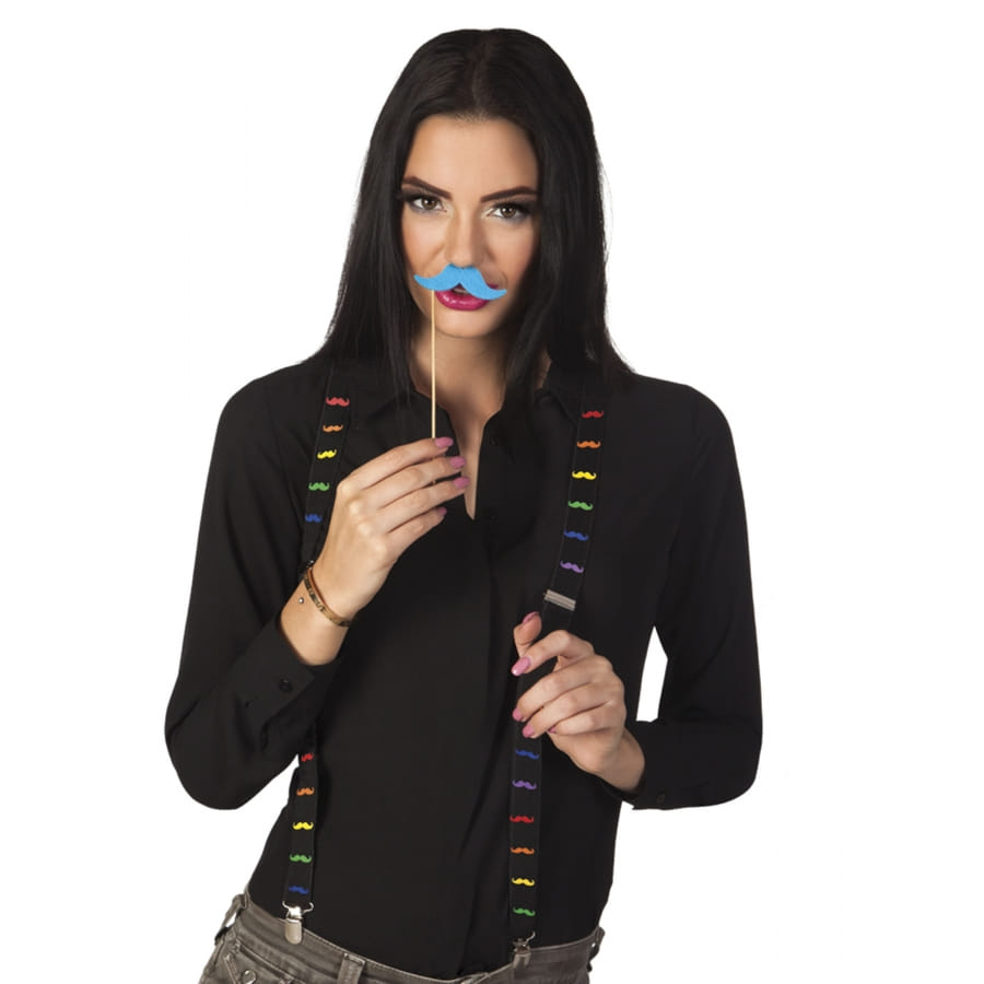 Les bretelles élastiques noires imprimé moustaches colorées sont un accessoire unisexe pour adulte.