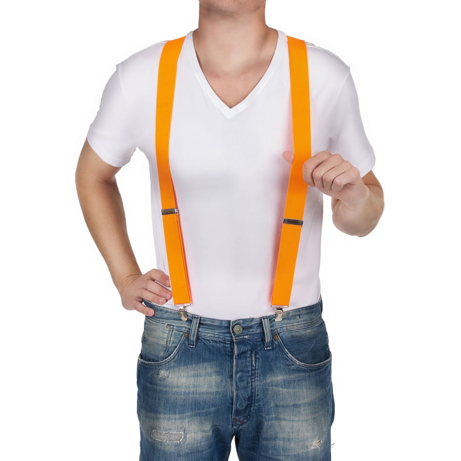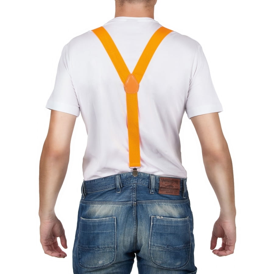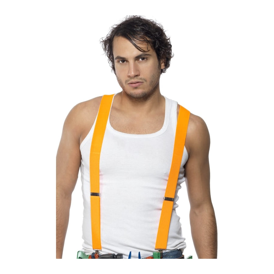 Paire de bretelles réglables en élastique de couleur orange fluo, pour homme. Ces bretelles sont parfaites pour plusieurs déguisements tels que celui de clown, de gangster ou pour un enterrement de vie de garçon ou de jeune fille.