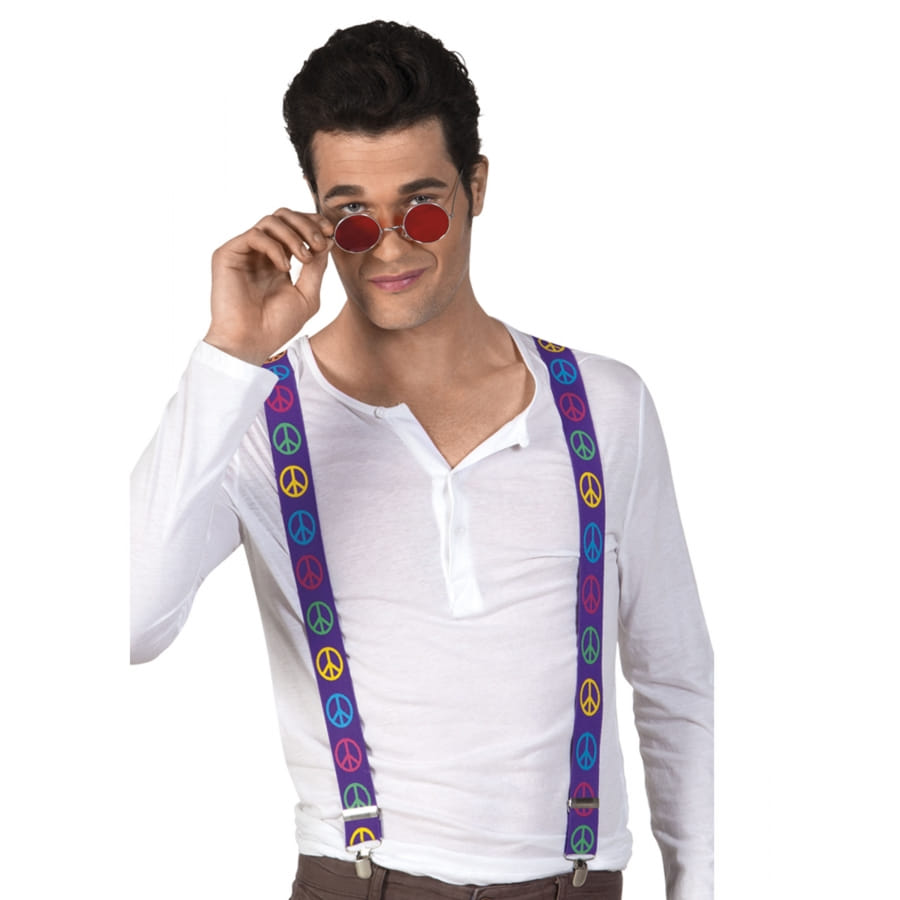 Faites un clin d'oeil à la mode hippie en complétant votre costume avec nos bretelles violettes imprimé peace and love coloré.
