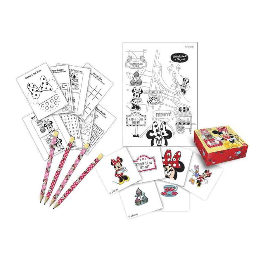 Amusez-vous avec une charmante petite souris : la ravissante Minnie Mouse ! Les enfants vont adorer ce pack de bricolages Minnie café. Il comprend divers articles sous licence Disney Mickey. Vous disposerez de 4 crayons rouges et roses, de 4 livrets de jeux, de 4 boîtes d'étiquettes et de 4 feuilles blanches avec dessins pour coller les étiquettes.