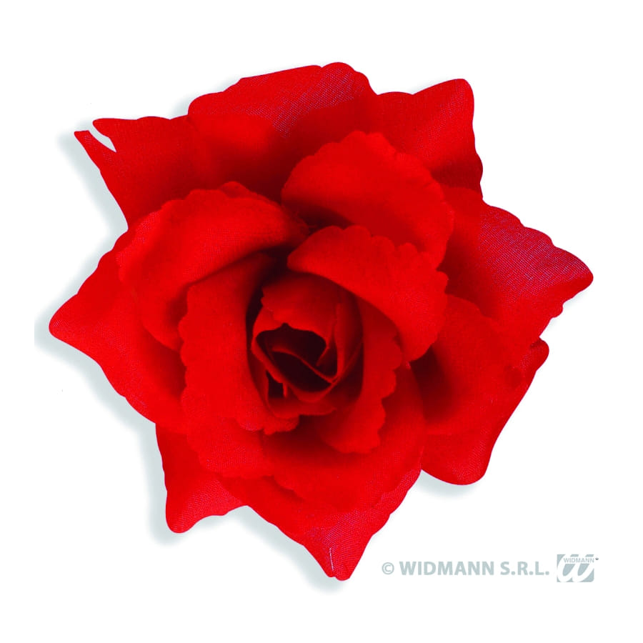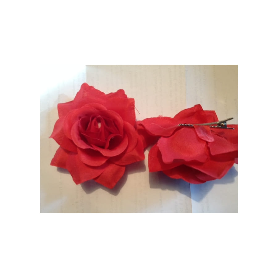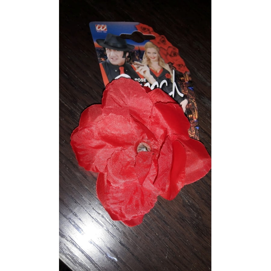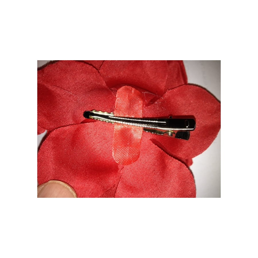 Fleur rouge montée sur une grosse pince pour femme. La taille de la broche est de 10 centimètres. C'est un accessoire de carnaval idéal pour incarner une danseuse espagnole ou pour un déguisement romantique.