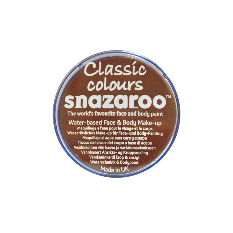 Peinture à l'eau de couleur marron pour le visage et pour le corps. Ce pot contient 18 millilitres de maquillage pour homme, femme ou enfants. Cette couleur-ci sera très utile pour un déguisement afro ou d'Indien d'Amérique.