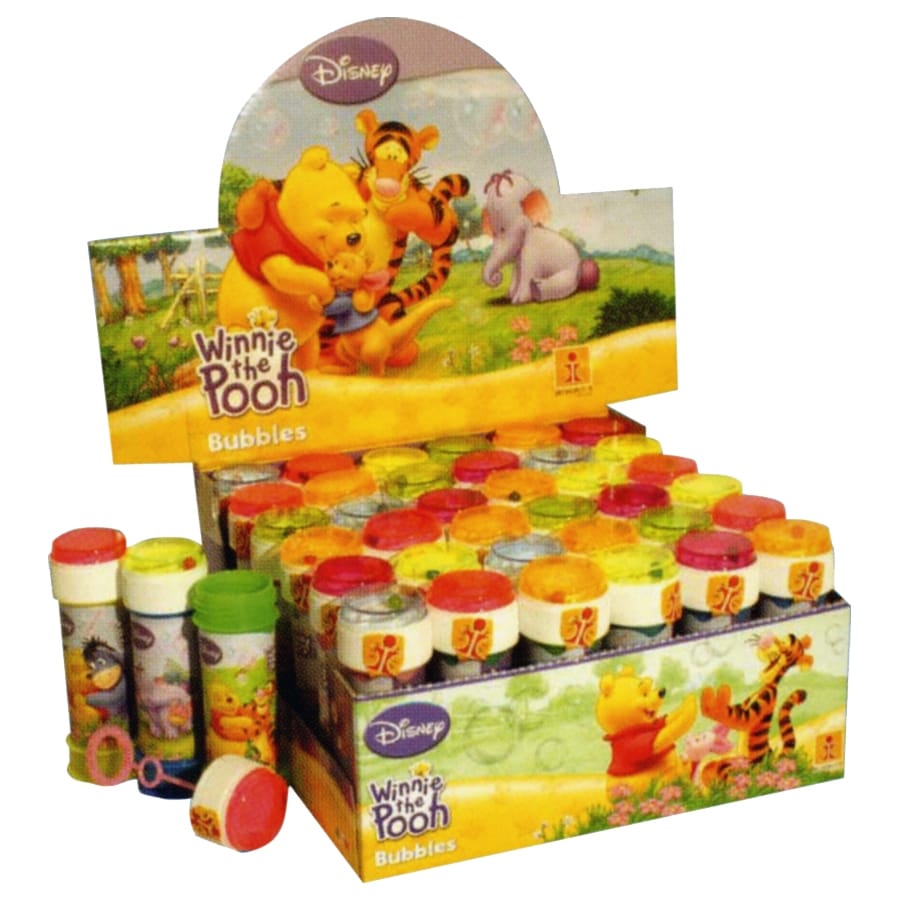 Tube de bulles de savon "Winnie et ses amis" sous licence Disney. Chaque tube contient 60 millilitres de liquide et dans chaque bouchon est logé un jeu de patience. Distribuez-en aux enfants lors d'anniversaires.