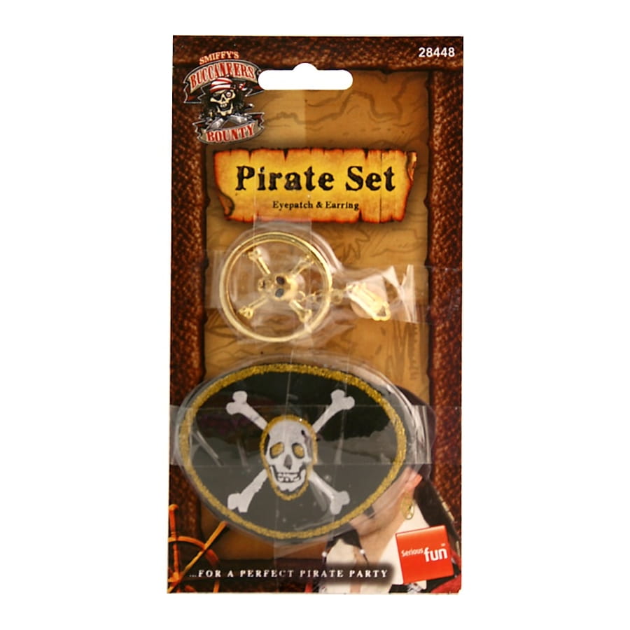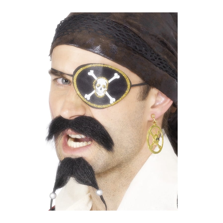 Set d'accessoires de pirate pour homme composé d'un cache-oeil noir et doré avec un symbole de pirate et une boucle d'oreille dorée avec tête de mort également. Transformez-vous en pirate avec ce set!