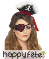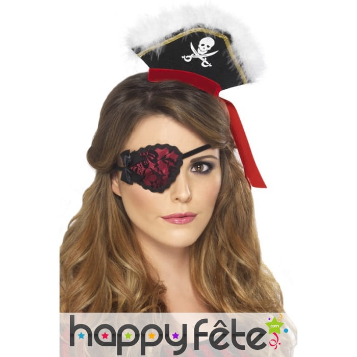 Cache-oeil de couleur noire et rouge, pour femme. Cet accessoire est très féminin, car entièrement fabriqué en dentelle et également décoré d'un noeud. Celle-ci forme de jolis motifs de fleurs sur le cache-oeil. Ajoutez-le à votre déguisement de femme pirate pour y ajouter un peu de féminité.