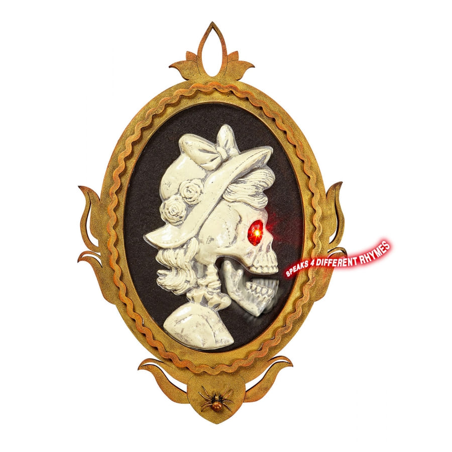 Car voyez-vous, cette dame a un petit côté... vivant. Enfin, pour une squelette. Si quelqu'un s'approche (grâce à un détecteur de mouvement), hop! L'oeil du squelette s'allume d'un rouge intense, et là - tenez-vous bien - elle commence à réciter non pas une, mais QUATRE comptines en anglais, tout en bougeant la mâchoire. Frisson garanti pour tout le monde!