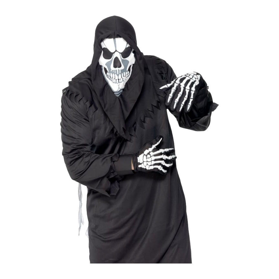 Ce set de déguisement sera parfait pour le carnaval ou encore Halloween. De couleur noir et blanc, il est composé d'une cagoule avec imprimé dessus la tête d'un squelette ainsi que des gants qui a les mains d'un squelette dessus.