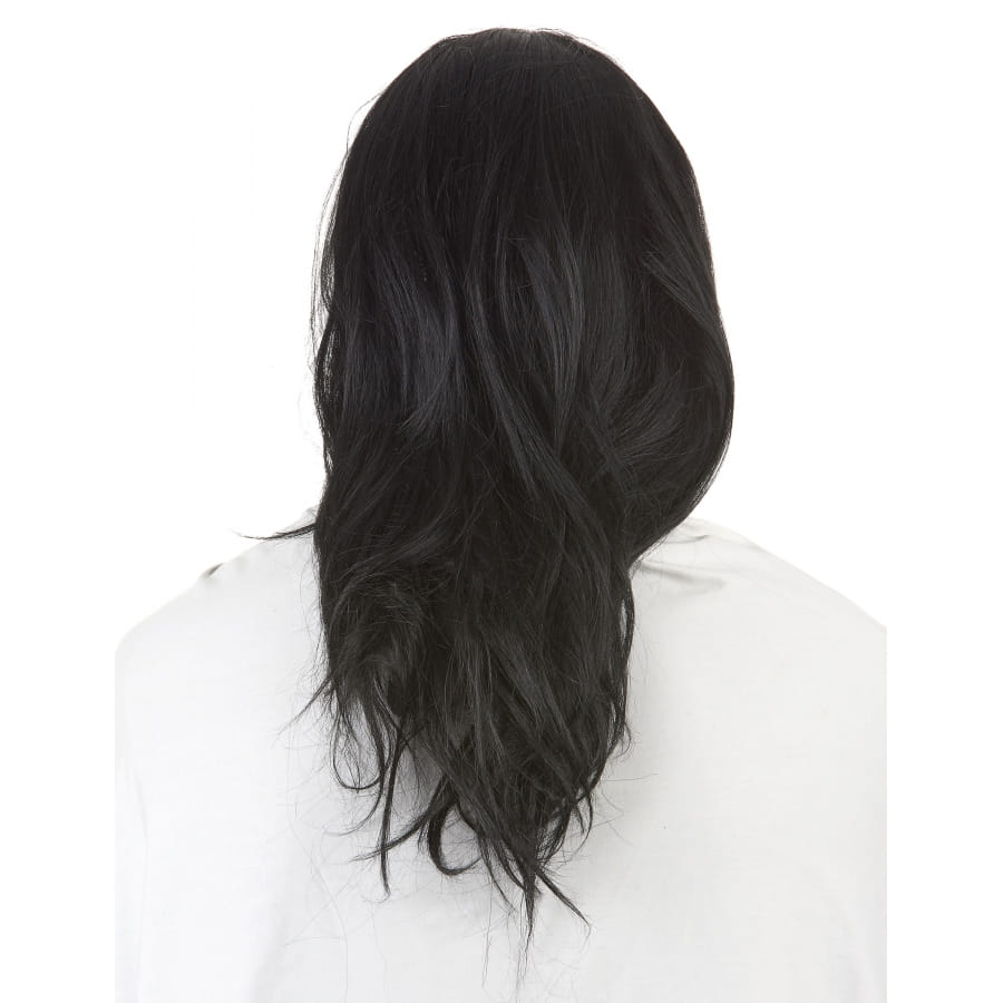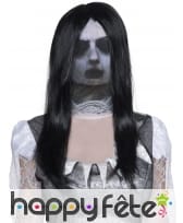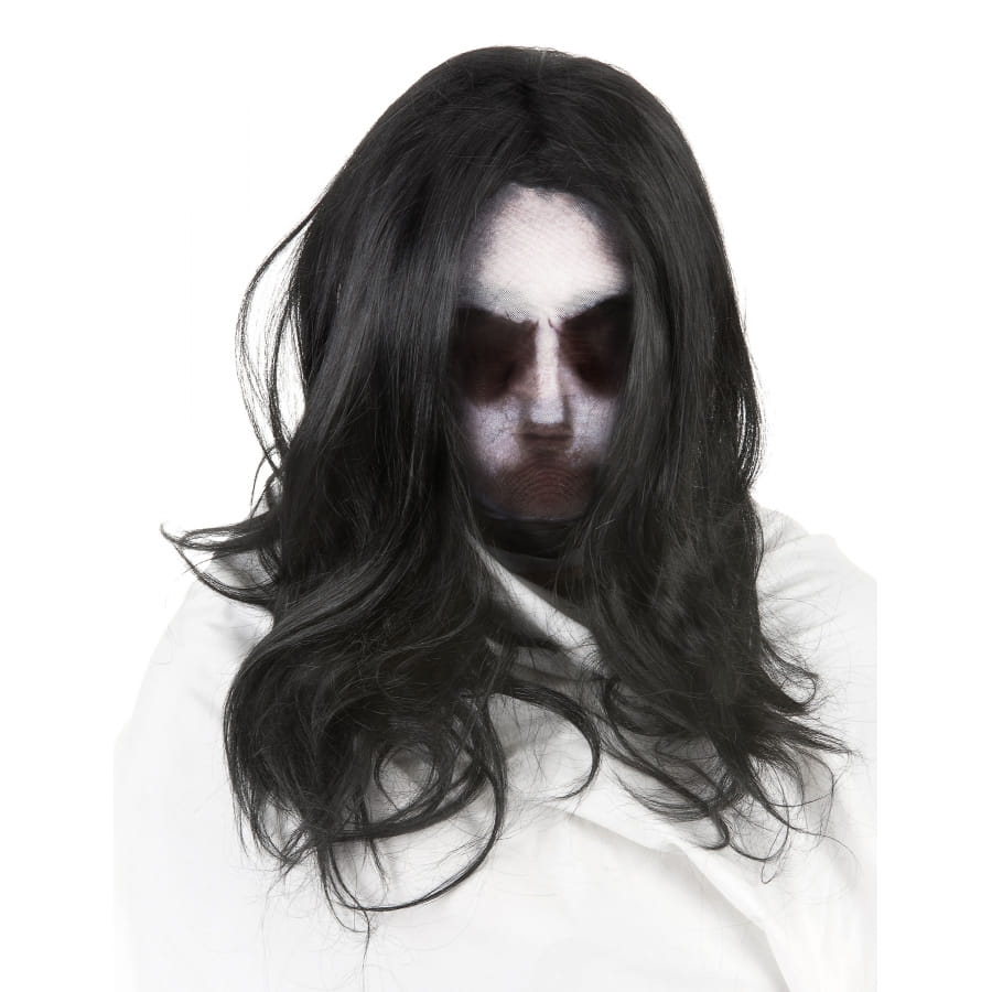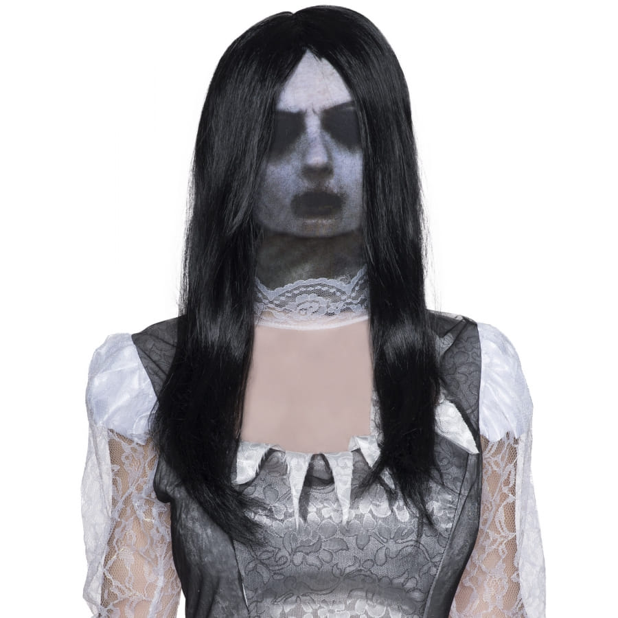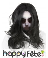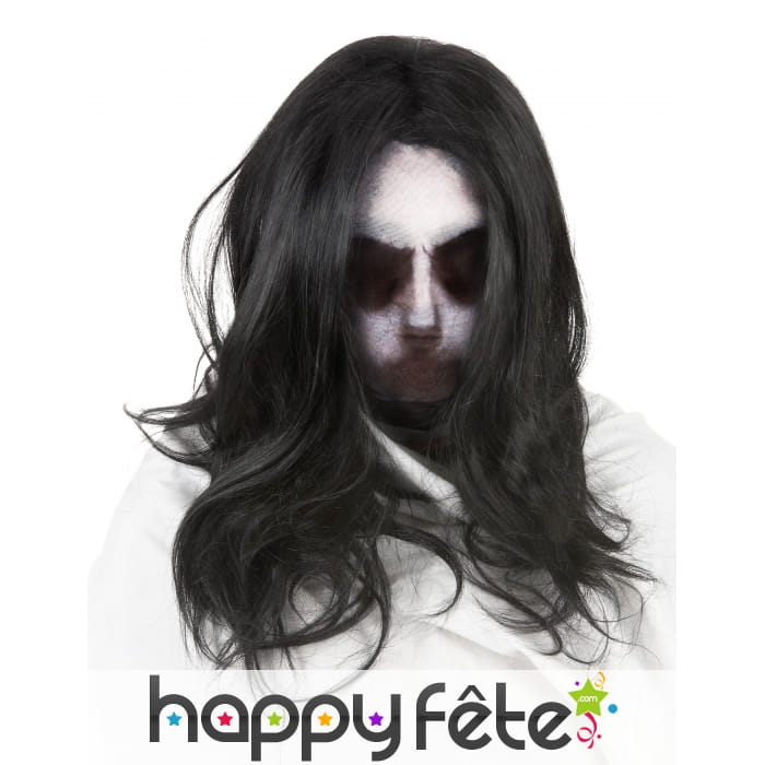 Une longue chevelure synthétique noire est directement intégrée sur cette cagoule facile à enfiler.