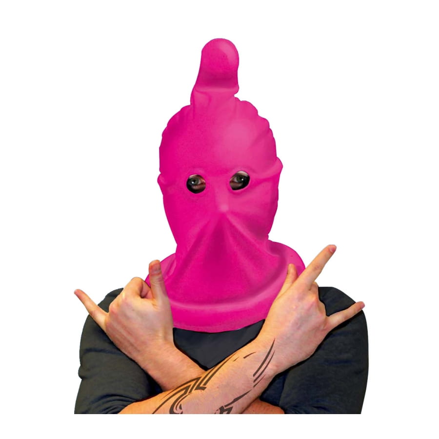 Cette cagoule a la forme d'un préservatif et est entièrement de couleur rose.
