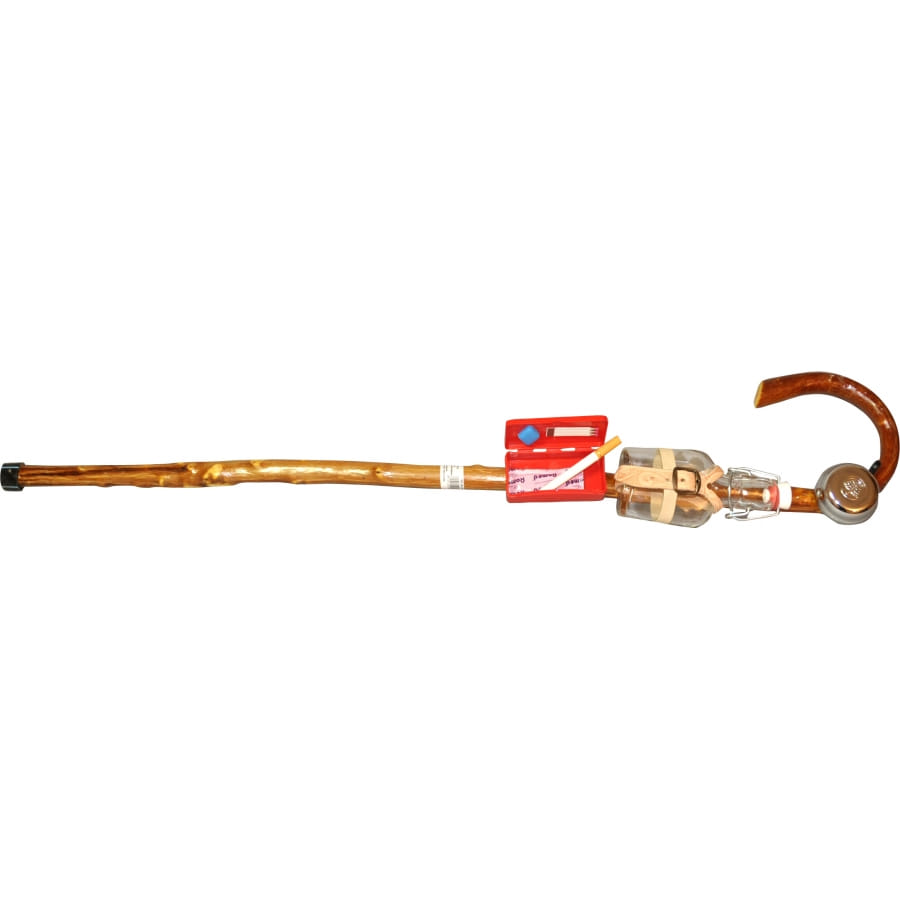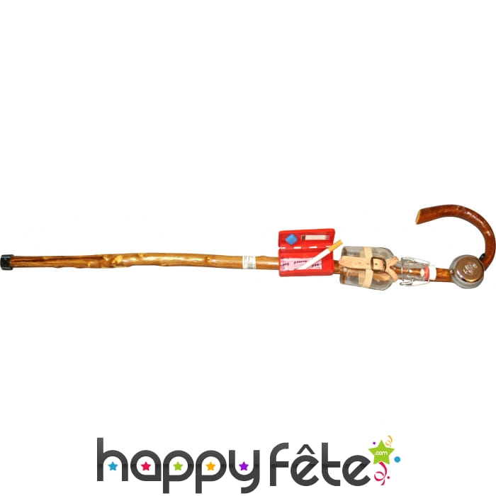 Pour faire une bonne blague pourquoi ne pas vous en servir de ce set. Ce canne du marcheur en bois est composé d'une sonnette, 'une bouteille avec porte bouteille, une fausse cigarette, une fausse pilule de fortifiant sexuel ainsi que des allumettes.