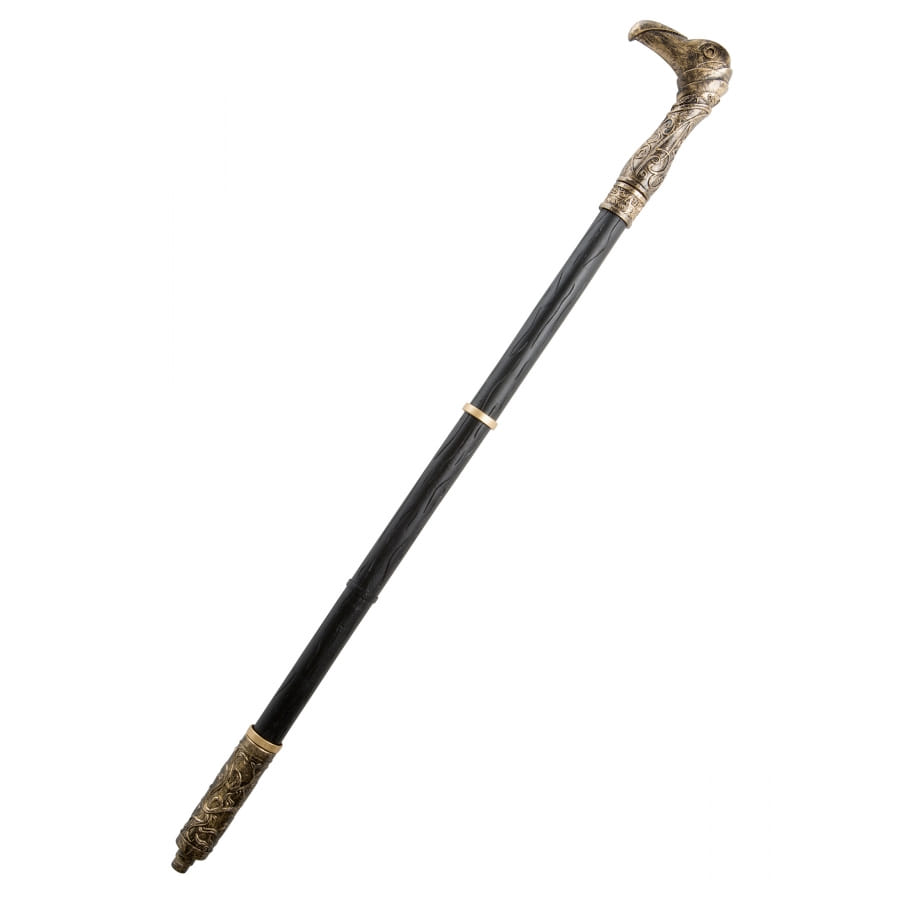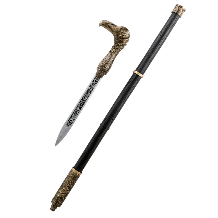 Faite en plastique et mesurant 78 cm de haut environ, cet accessoire se décline en deux parties dont un étui noir avec une partie dorée, et une mini-épée avec lame argentée et garde dorée à l'effigie d'une tête de faucon.