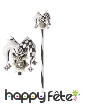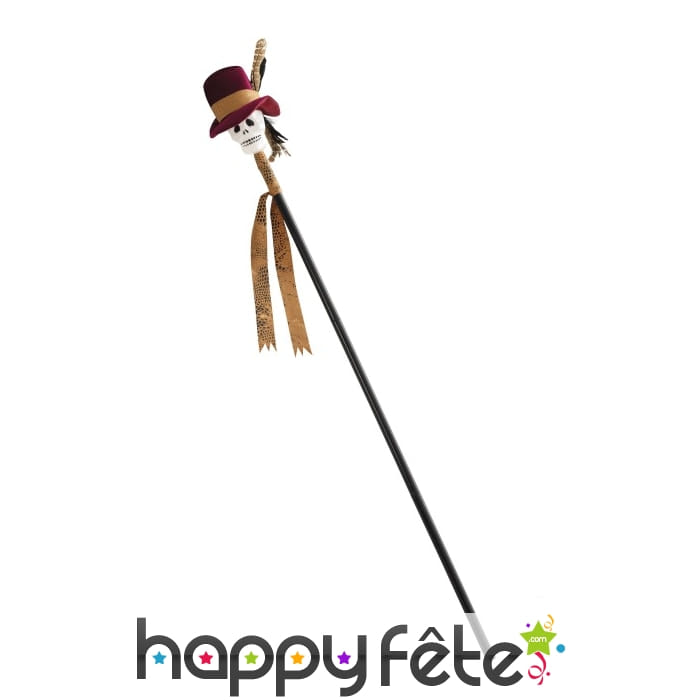 Vous avez misé sur un costume de sorcier vaudou pour halloween et il vous faut un accessoire ? Commandez une canne vaudou et votre déguisement sera impeccable ! Cette canne noire, sur laquelle est attaché un ruban beige, porte à son bout une tête de mort de couleur blanche. La tête est couverte d'un petit chapeau haut de forme rouge, avec une bande jaune. Le couvre-chef est également orné d'une petite plume.