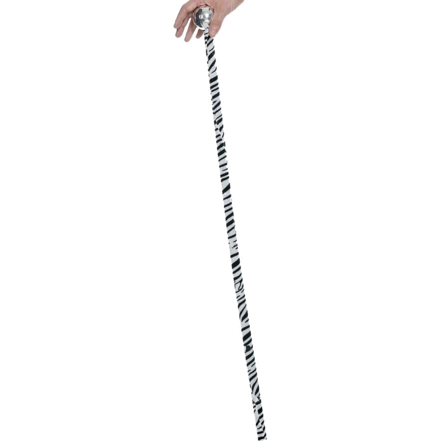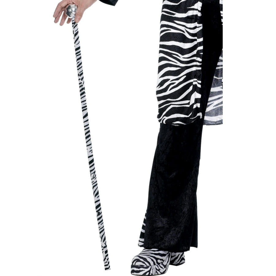 Canne aux motifs zébrés. L'accessoire vient en blanc, noir et argent. Cette canne Bling Bling pour homme est surmontée d'un pommeau en forme de boule argentée. Elle est idéale pour vos soirées disco et paillettes.