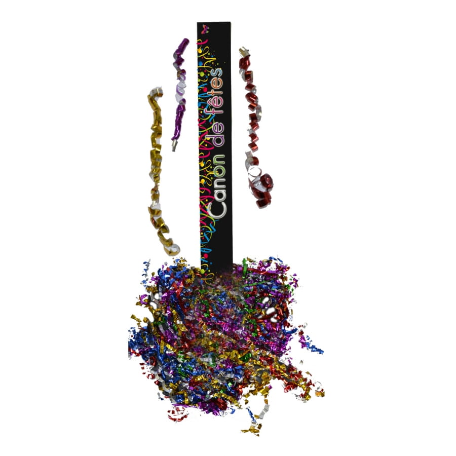 Les 12 coups de minuit sonnent ! Voici venu le nouvel an, faites du bruit pour célébrer cet évènement. Voici l'accessoire indispensable pour créer une ambiance magique. Vous disposerez d'un canon à serpentins métallisés multicolores, de 20 cm. Les serpentins peuvent couvrir 5 à 8 mètres carrés de surface. A l'intérieur comme à l'extérieur, les tirs peuvent monter jusqu'à 2 ou 3 m de haut. Il suffit juste de tourner le haut et le bas du canon en sens opposés en même temps, et boum ! Prenez quand même garde à ne pas tirer sur quelqu'un. Il faut toujours tenir le canon bien droit avec l'opercule en haut.