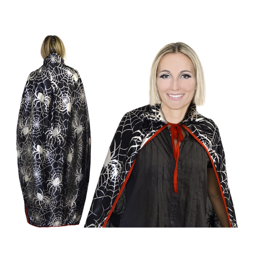 Superbe cape de couleur noire avec ornements argentées en forme d'araignées et de toiles d'araignées, pour homme ou femme. Cette cape mesure 150 centimètres de long, vous recouvrant parfaitement jusqu'aux chevilles. Elle est également ornée d'une fine bordure rouge.
