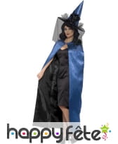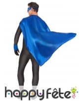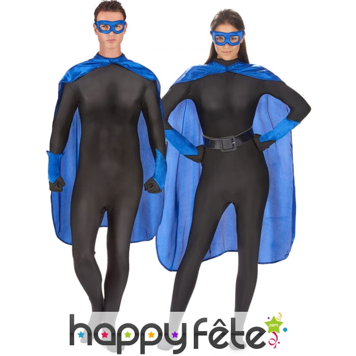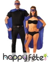 La cape, les manchettes et le masque bleu pour adulte sont des accessoires en tissu satiné.