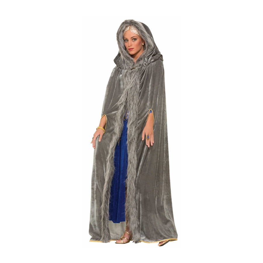 Vous aurez bien l'air mystérieux avec cette cape médiévale en fourrure. Elle est entièrement de couleur grise, avec une capuche et de la fausse fourrure sur les bords. De style très médiéval, homme ou femme pourront le mettre pour compléter un déguisement historique de l'époque du Moyen-âge, ou un déguisement de sorcier ou de sorcière.