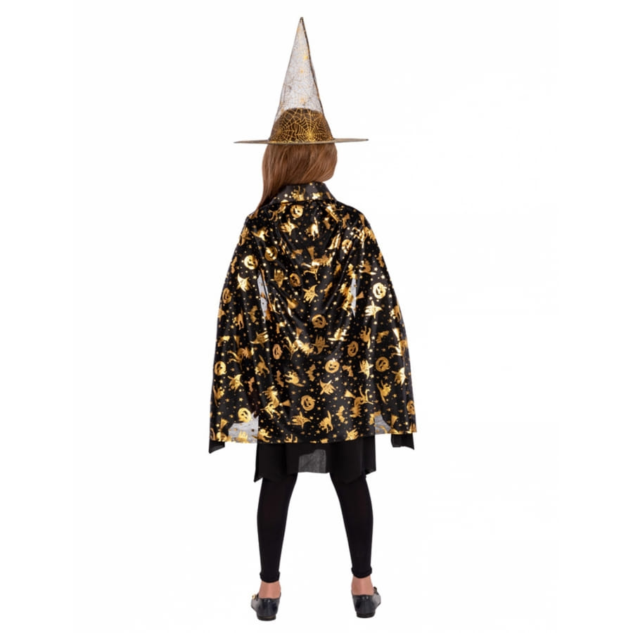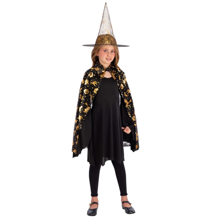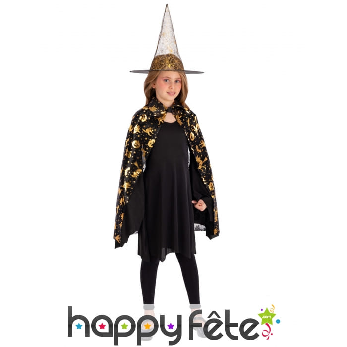 La chasse aux bonbons devra compter avec votre fille, dans sa cape noire or et chapeau de sorcière pour enfant.