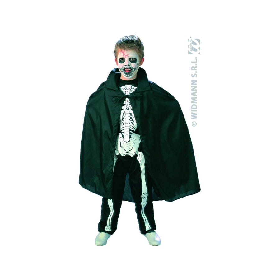 Cape de couleur noire en nylon. La cape pour enfant mesure 90 centimètres de long. Elle est idéale pour compléter un déguisement de vampire ou de squelette pour Halloween.