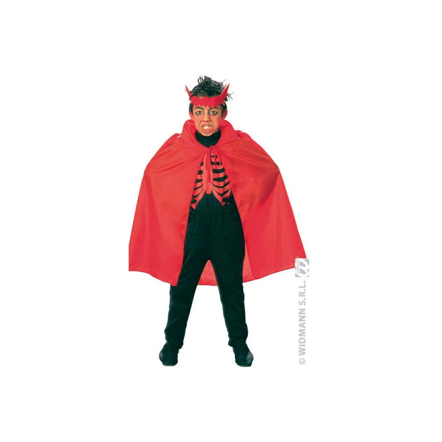 Cape de couleur rouge en nylon. La cape mesure 90 centimètres de long. Elle est idéale pour faire de votre enfant un petit diable ou une diablesse, un vampire ou un démon le soir d'Halloween ou pour les fêtes d'anniversaire.