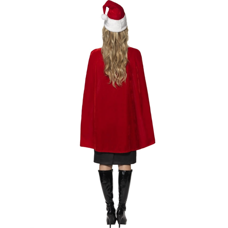 Cape de luxe pour femme avec coiffe incluse. La cape est entièrement rouge avec rebords blancs et mesure 120 centimètres de large sur 85 centimètres de longueur. Le bonnet est rouge avec rebord et pompom blancs et possède un tour de tête de 56 centimètres. Cette cape complétera parfaitement votre déguisement de Miss Noël.