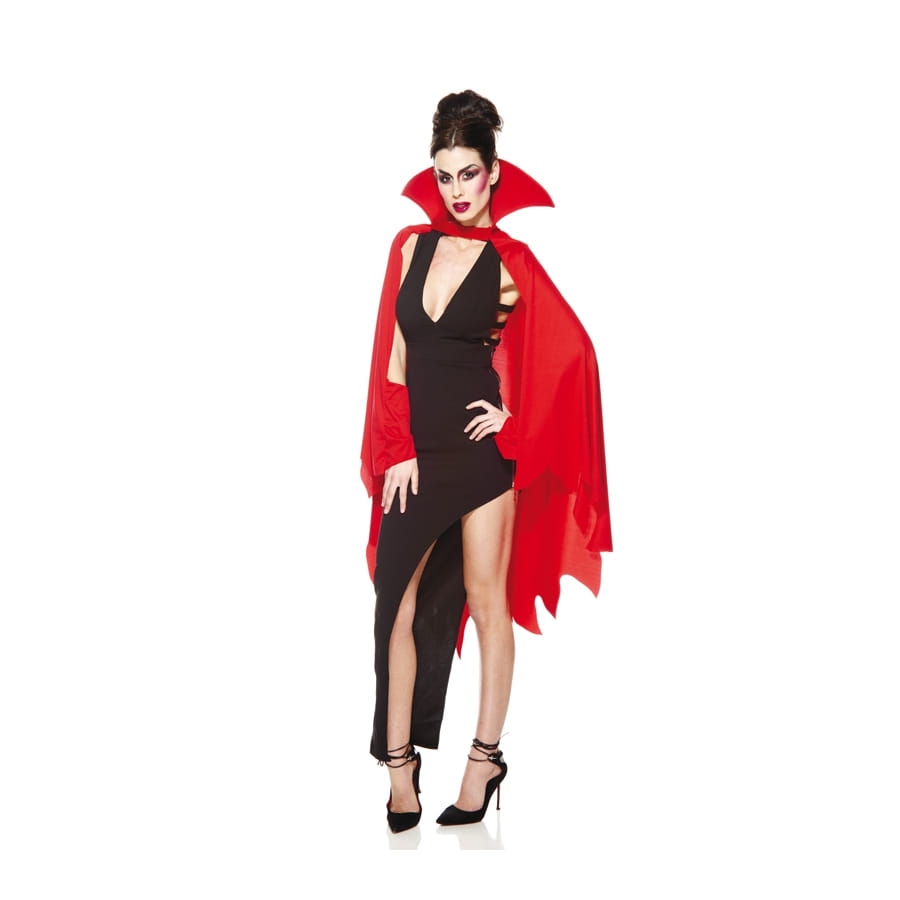 Pour la prochaine fête à thème en vue, misez sur un accessoire original. Si vous avez décidé de porter une jolie robe sexy noire, associez votre tenue avec cette élégante cape rouge à grand col. Mi-longue, la bordure affiche une découpe en dent de scie, ce qui en fait un accessoire d'Halloween parfait. Une encolure permet de fermer la cape au niveau du cou.
