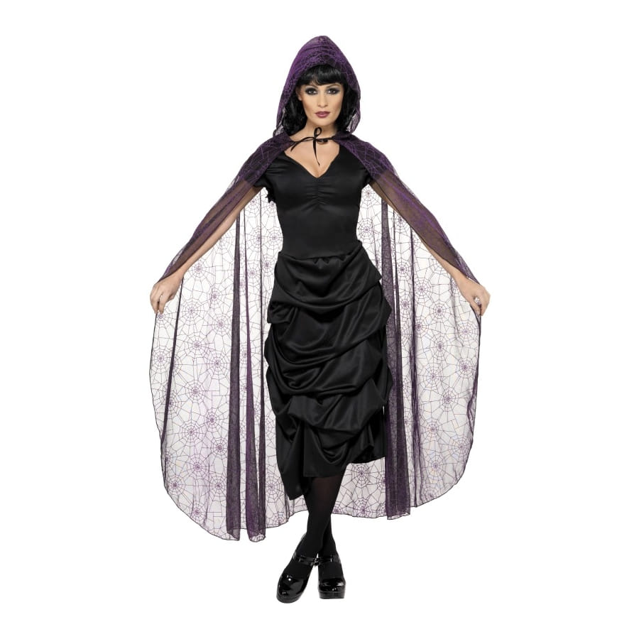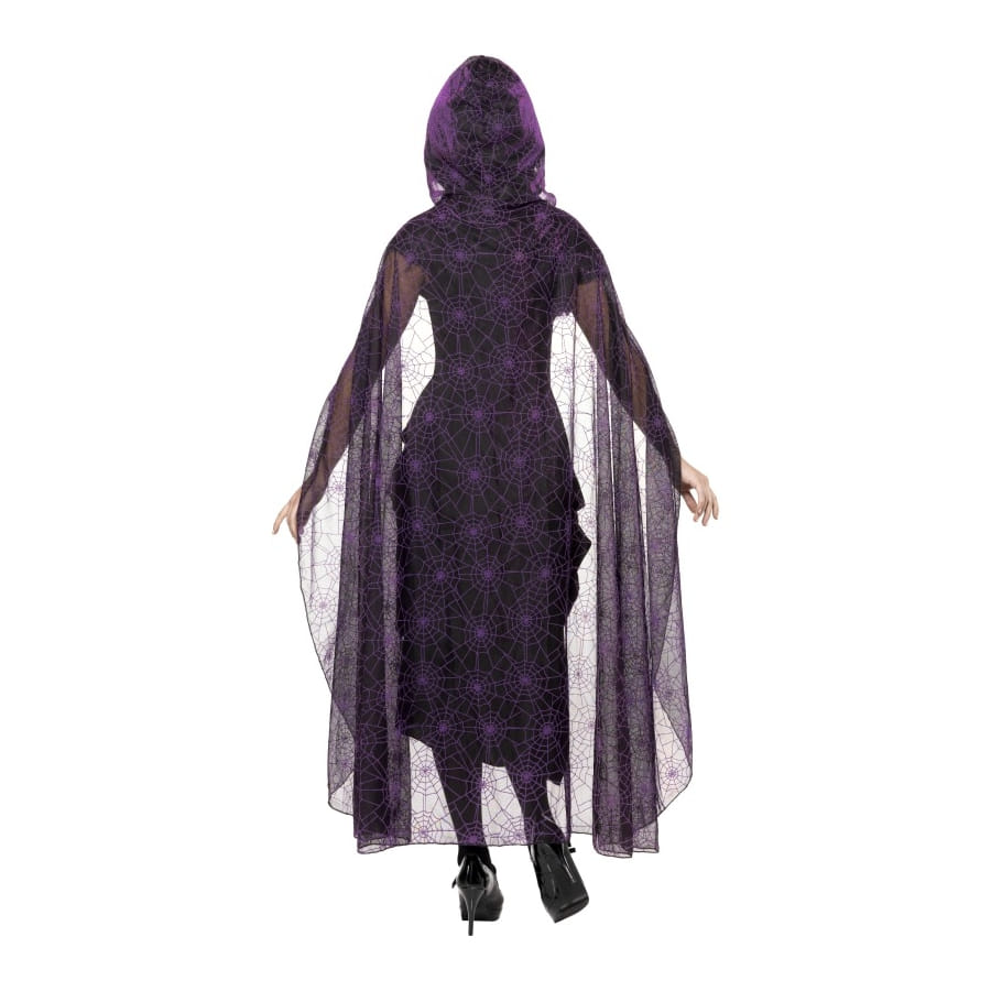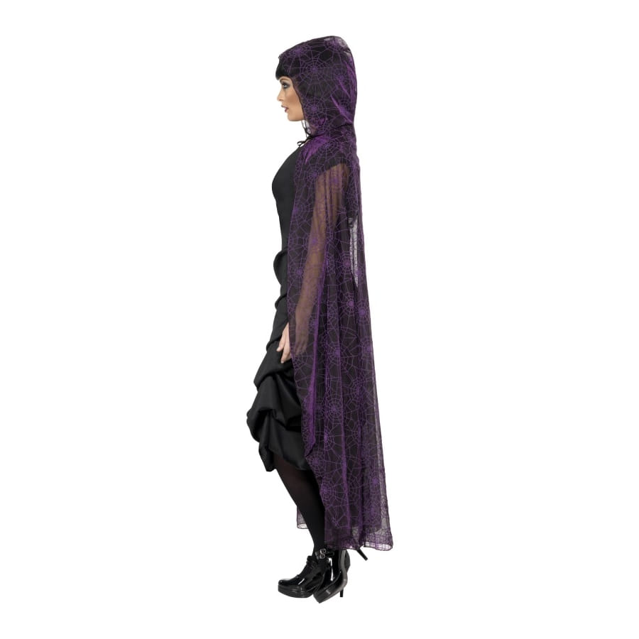Longue cape de couleur violette avec capuche, pour femme ou adolescente. Cette magnifique cape est semi-transparente et entièrement imprimée de motifs toiles d'araignées très fins. Enfilez-la pour compléter votre déguisement de personnage maléfique avec beaucoup d'originalité.