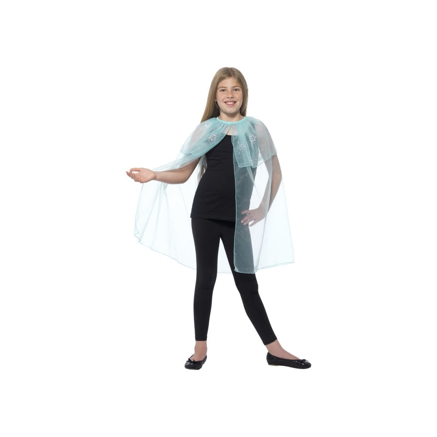 Cet accessoire cape transparente flocons de neige taille enfant est dédié spécialement aux petites filles. Celui-ci est composé d'une jolie cape bleue transparente constituée par deux couches. La petite couche qui se trouve à l'extérieur est ornée de flocons de neige blancs. Ce sera un accessoire idéal pour compléter un déguisement de fée ou de princesse.
