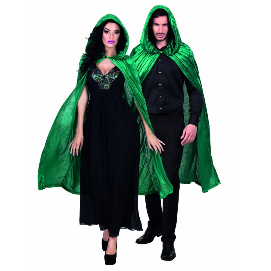 Rien de plus original que cette cape verte effet velours avec capuche, pour agrémenter votre costume de magicien.