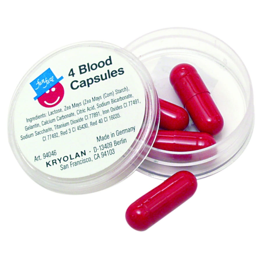 Capsules de sang en poudre à croquer de la marque professionnelle Kryolan. Les capsules sont vendues en boîte de 4. Déguisez-vous en vampire ou en tueur en croquant ces capsules et en semant la terreur autour de vous.