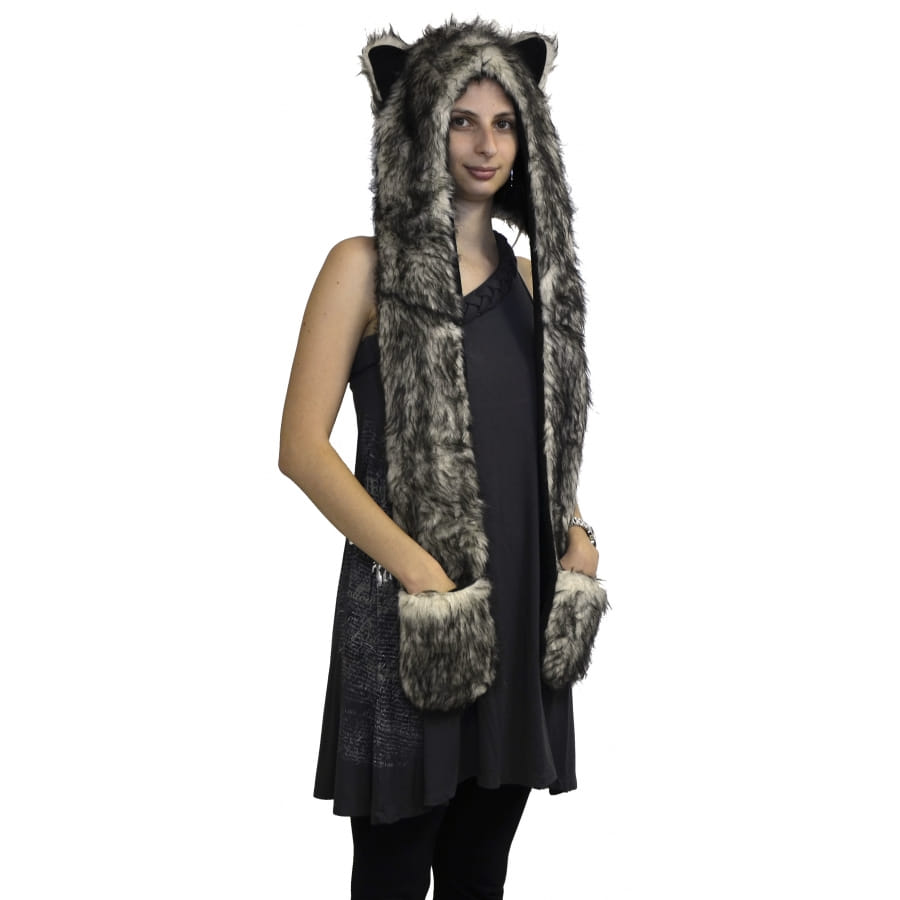 Optez pour un accessoire original en choisissant cette mi-écharpe et mi-capuche en fourrure de loup synthétique. La capuche est ornée de petites oreilles tandis que l'écharpe est dotée de poches pour y mettre vos mains. La fourrure est de couleur noire et grise, entièrement en polyester. Vous pourrez l'emporter avec vous pour un séjour au ski ou pour agrémenter un déguisement. Lavage à 30 degrés maximum.