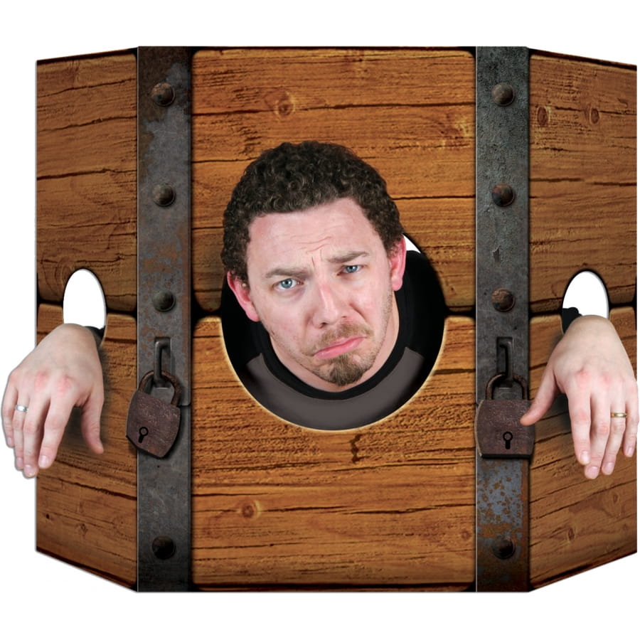 Décoration en forme de carcan médiéval de grandeur nature de couleur marron et noire. Cet accessoire assez effrayant à première vue est parfait pour prendre des photos souvenirs au cours d'une fête basée sur un thème médiéval.
