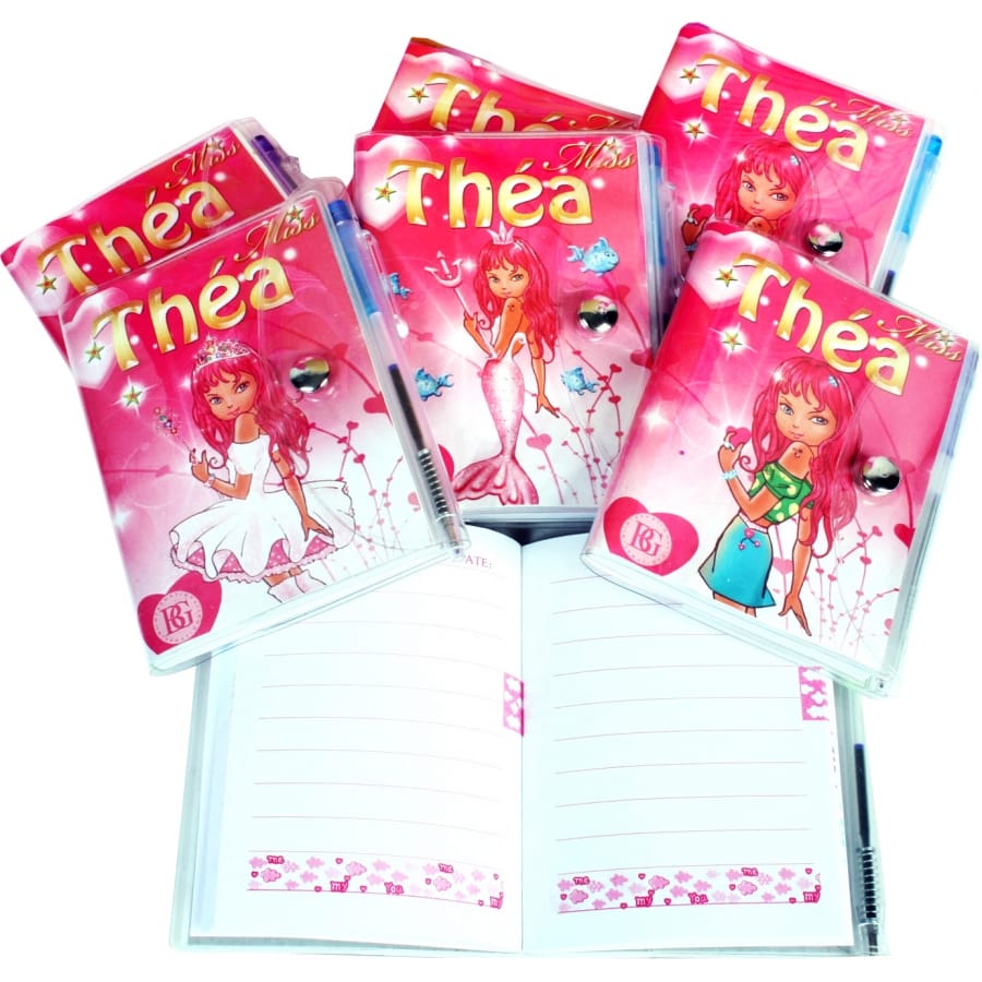 Carnet mémo et stylo "Miss Théa" de couleur rose. Le carnet mesure 10 centimètres de long sur 8 centimètres de large. Il sera impossible de choisir ni modèle ni couleur lors de la commande. Vous recevrez un des carnets présentés. Votre fille adorera ce set.