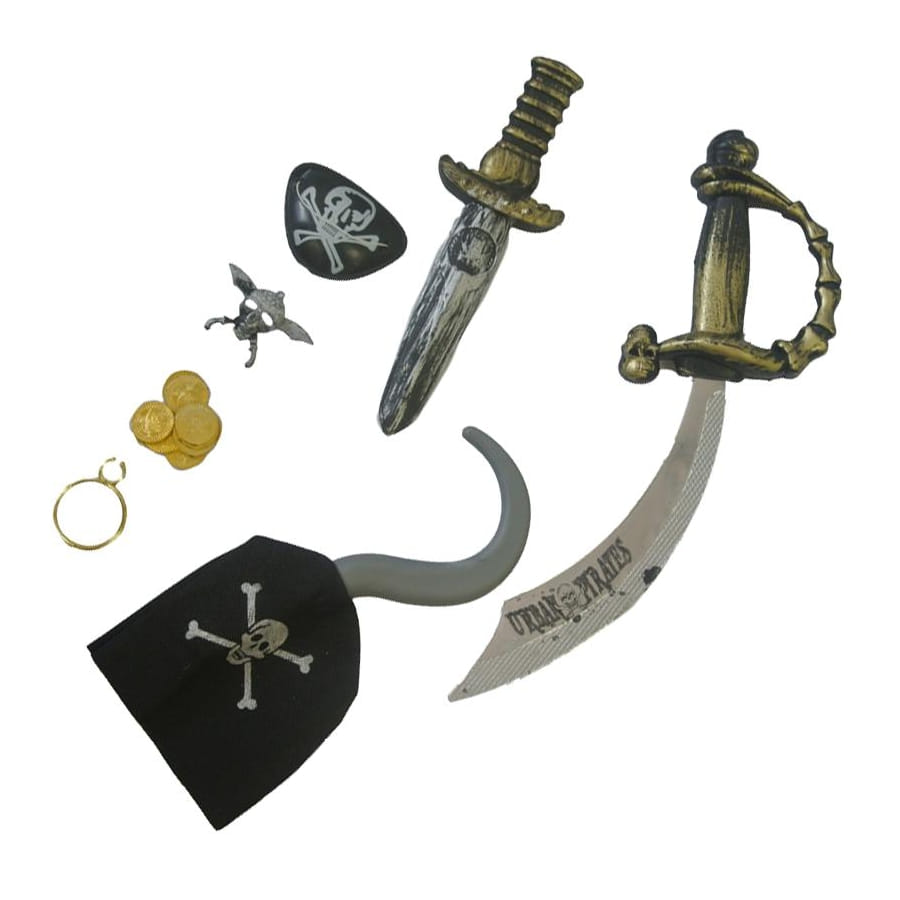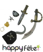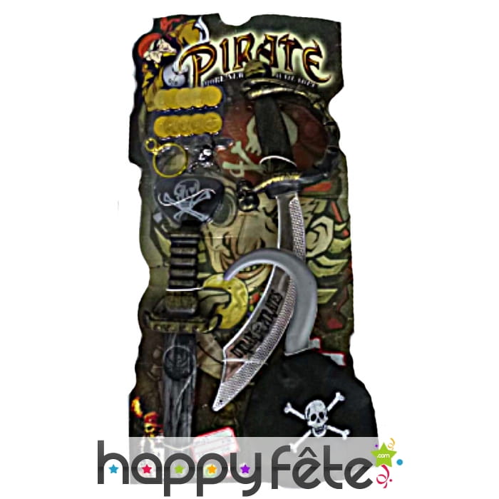 Retrouvez tout un équipement de pirate sur cette carte d'accessoire de 52 x 24,5 cm de dimension. Vous en aurez assez pour vous amuser ou vous déguiser ! Le lot comprend un cimeterre, un coutelas, une boucle d'oreille créole, une tête de mort et 10 doublons dorés. Le tout est assorti et porte les couleurs noir et argent. Paré pour l'aventure, montez à bord du navire petit pirate !