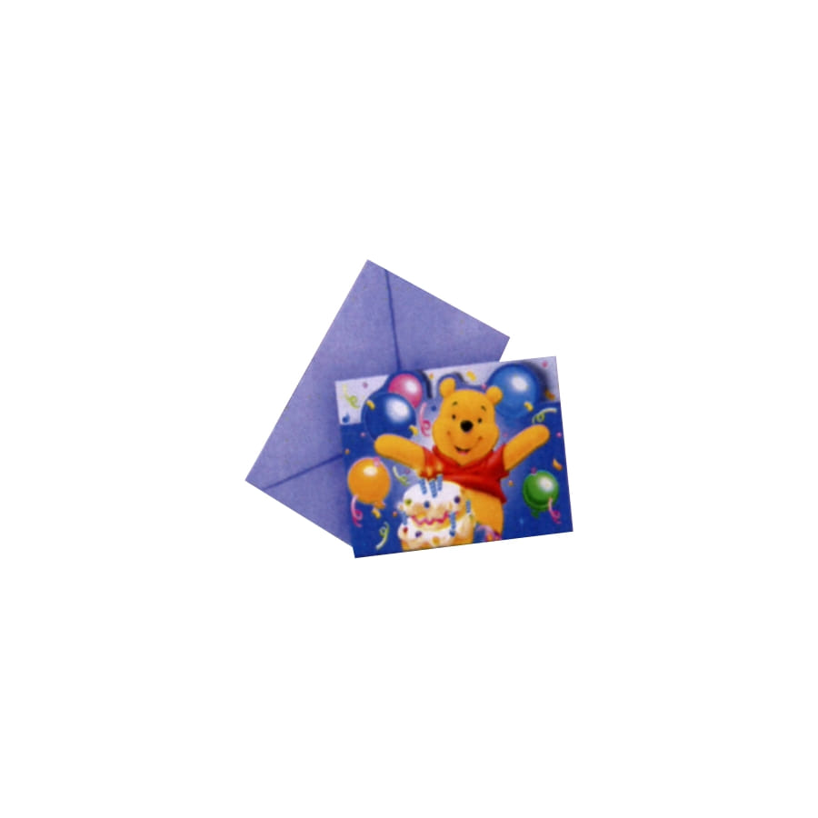 Vous organisez un anniversaire avec pour thème Disney ou Winnie l'Ourson vous aurez besoin de ces cartes d'invitations pour inviter ses amis . Ce lot de 6 cartes Winnie l'Ourson multicolores avec Winnie derrière un gâteau et des ballons, sans oublier les enveloppes violettes.