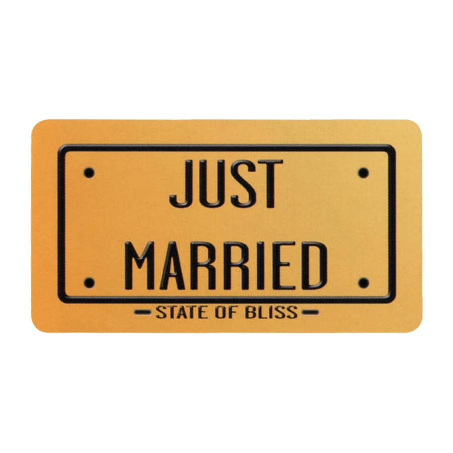 Décor en carton jaune et noir, avec "Vive les Mariés" sous-ligné de "Etat du Bonheur" sur une face et sur l'autre, "Just Married" sous-ligné de "State of Bliss". Accrochez ce carton devant votre entrée ou sur votre voiture pour faire savoir à tout le monde que vous venez de vous marier!